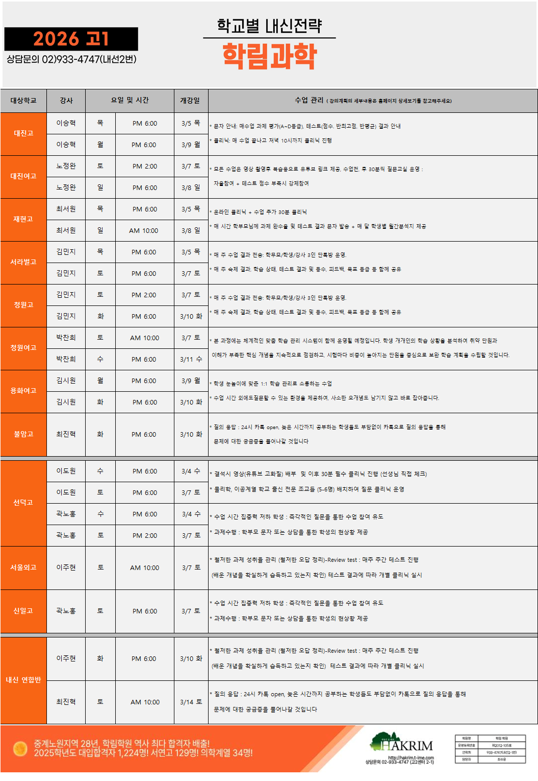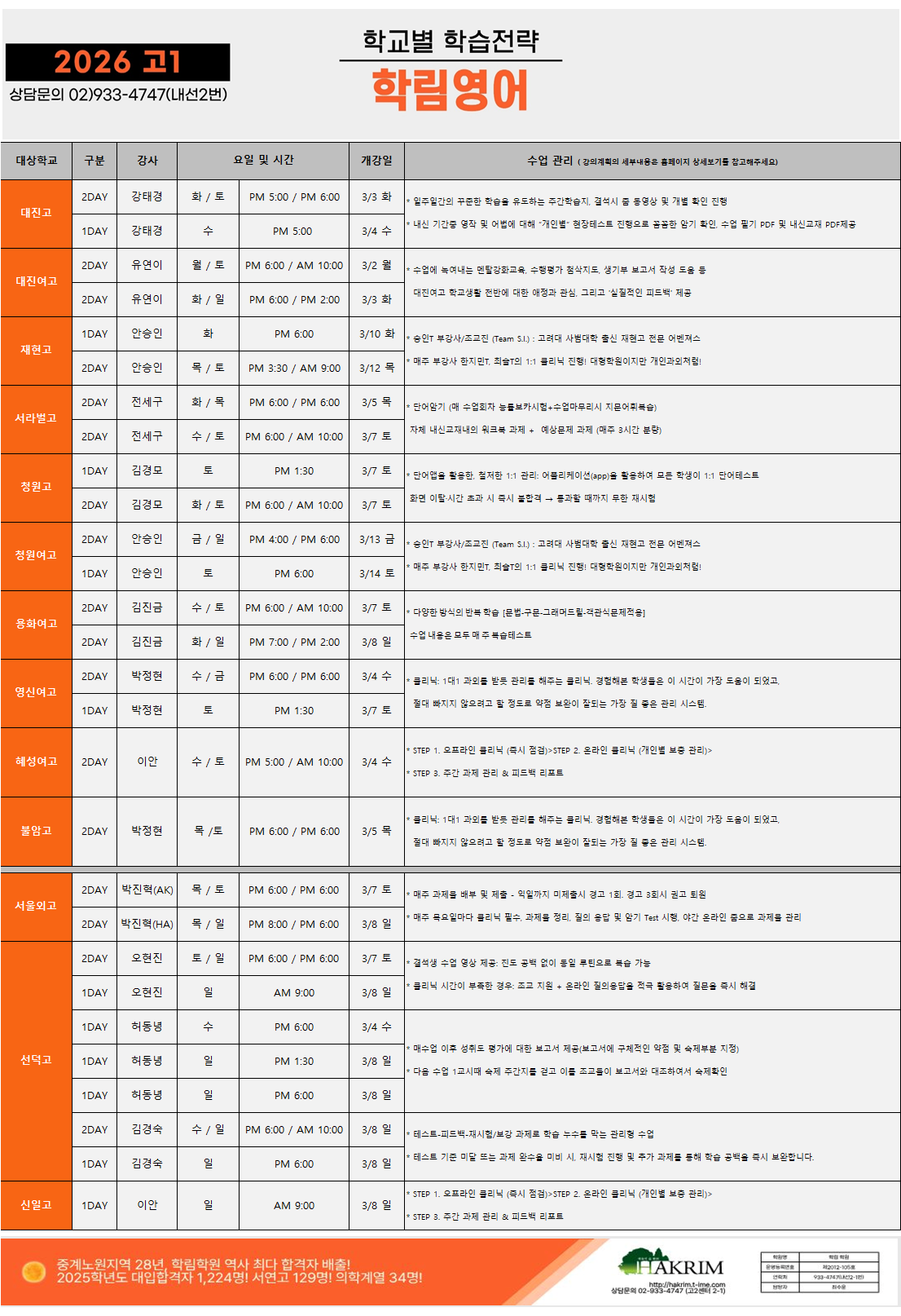 [2026_고1] 3월 개강 시간표